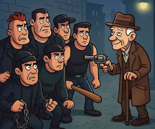 ![]() Старенький, худенький дедушка идёт по тёмному переулку. Ночь, фонари мигают, ветер гоняет бумажки. Он опирается на трость, шаркает ногами, бормочет что-то себе под нос, то ли стихи, то ли воспоминания. Вдруг из тени выныривает банда: шестеро молодых хулиганов, в кожанках, с кастетами, цепями, один даже с бейсбольной битой. Окружают дедушку, ухмыляются.