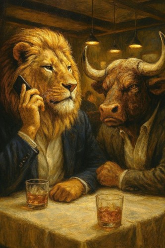 ![]() В одном ресторане, где подавали самые изысканные блюда для любых посетителей ресторана, где воздух был густ от аромата жареного мяса и дурманящего запаха свежескошенного сена, за столиком сидели двое. С одной стороны - Лев, царь зверей, чья грива была расчёсана с величием, а взгляд, даже в расслабленном состоянии, источал спокойную силу. Напротив него - Бык, могучий, упрямый, с шеей в пару обхватов и рогами, готовыми потревожить небеса.