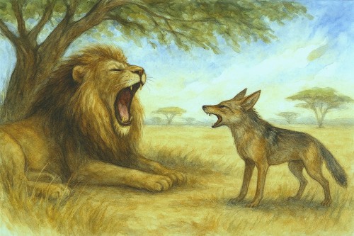 В полдень, когда саванна замирает от зноя, лев лежал в тени раскидистой акации. Его дыхание было ровным, взгляд ‑ спокойным. Он не охотился сегодня: не потому, что не мог, а потому что не нужно было. Из кустов выскочил шакал ‑ юркий, с блестящими глазами и голосом, как ржавый нож.